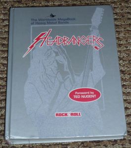 So back in 1995/1996 I was still married to my now ex-wife. She was a voracious reader and during our brief marriage inspired me to do some reading. Most of the time it was band/musician biographies. Sometimes it was just catching up on John Saul books (all of which suck anymore). One day I went to the library and was just thumbing through the reference books and came across “Headbangers – The Worldwide MegaBook of Heavy Metal Bands” by Mark Hale. I cracked it open and just started freaking out. This book had just about everyone in it that was a metal band. It spans from the late 60s to about 1990 and does a wonderful job of cross-referencing bands, listing albums and catalog numbers. There’s an index in the back of musicians, band names, countries of origin and record labels with catalog