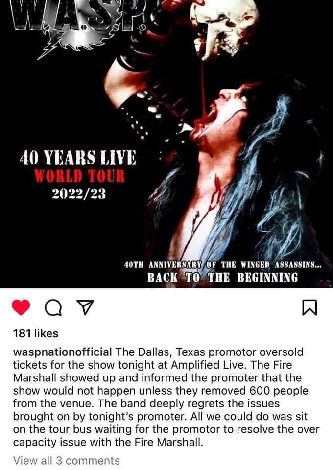 The venue had also been selling $10 tickets leading up to the show and just recently started charging for parking. Sounds like they were trying to make up the deficit of booking an expensive show in contrast to the ticket prices and capacity. The promoter, the venue and WASP all have a responsibility in this. Based on the other much larger venues they had been booked in, this place was far too small to handle such a show. Not that it really matters, but I can’t see myself ever attending another show there. I heard a ton of horror stories about that place that night and it all made sense.