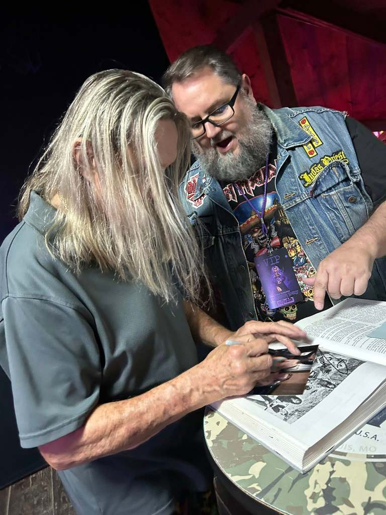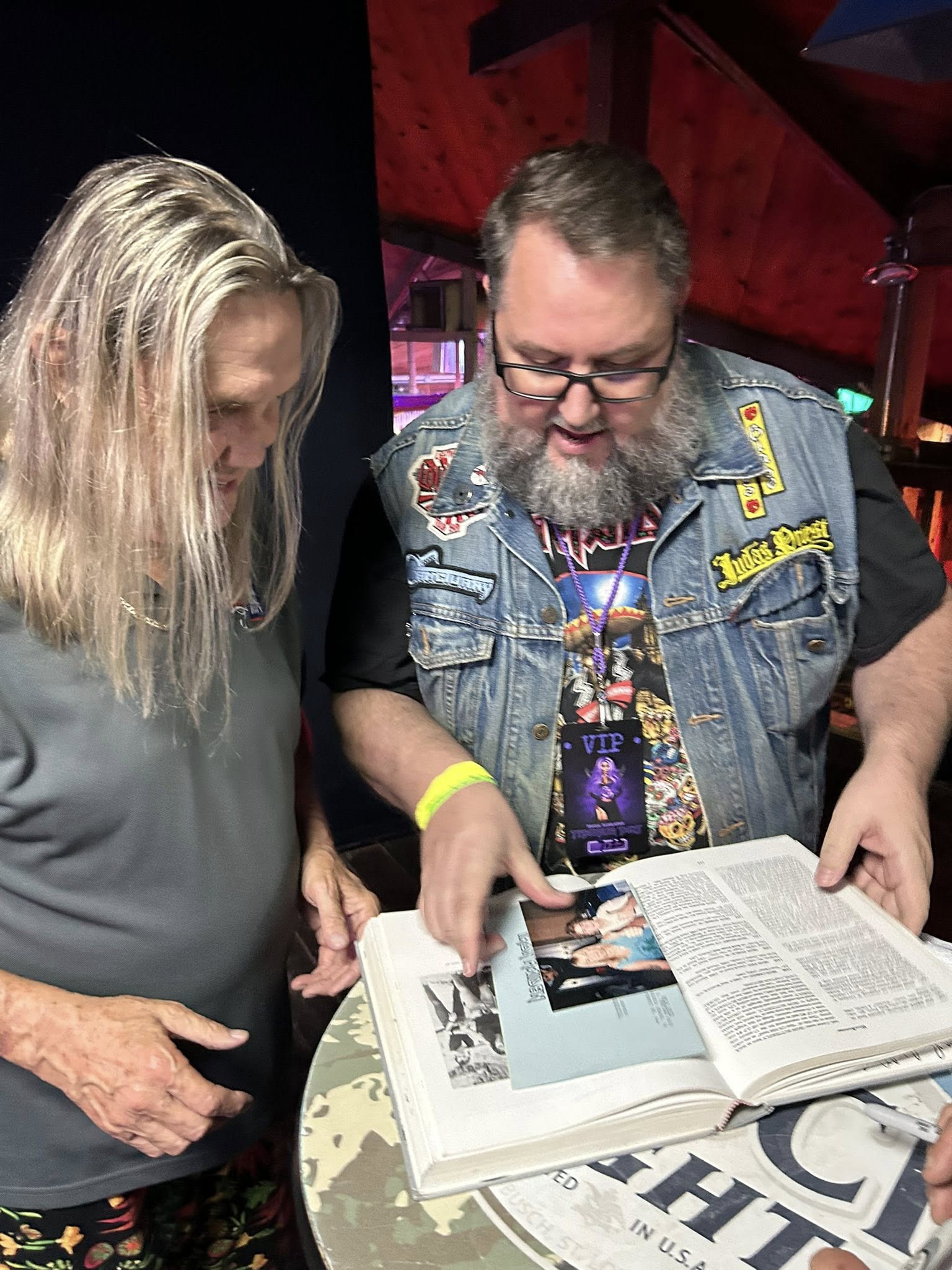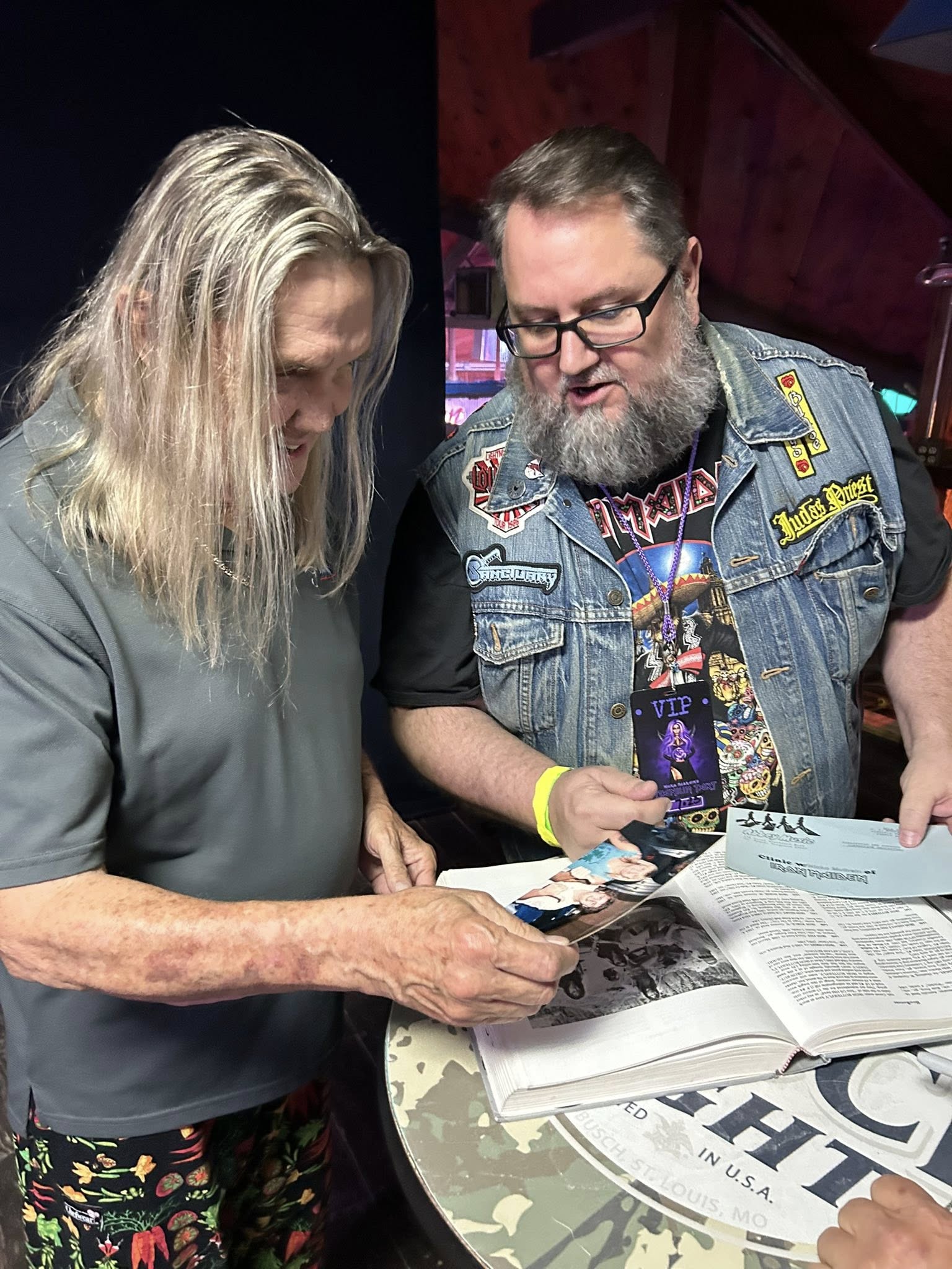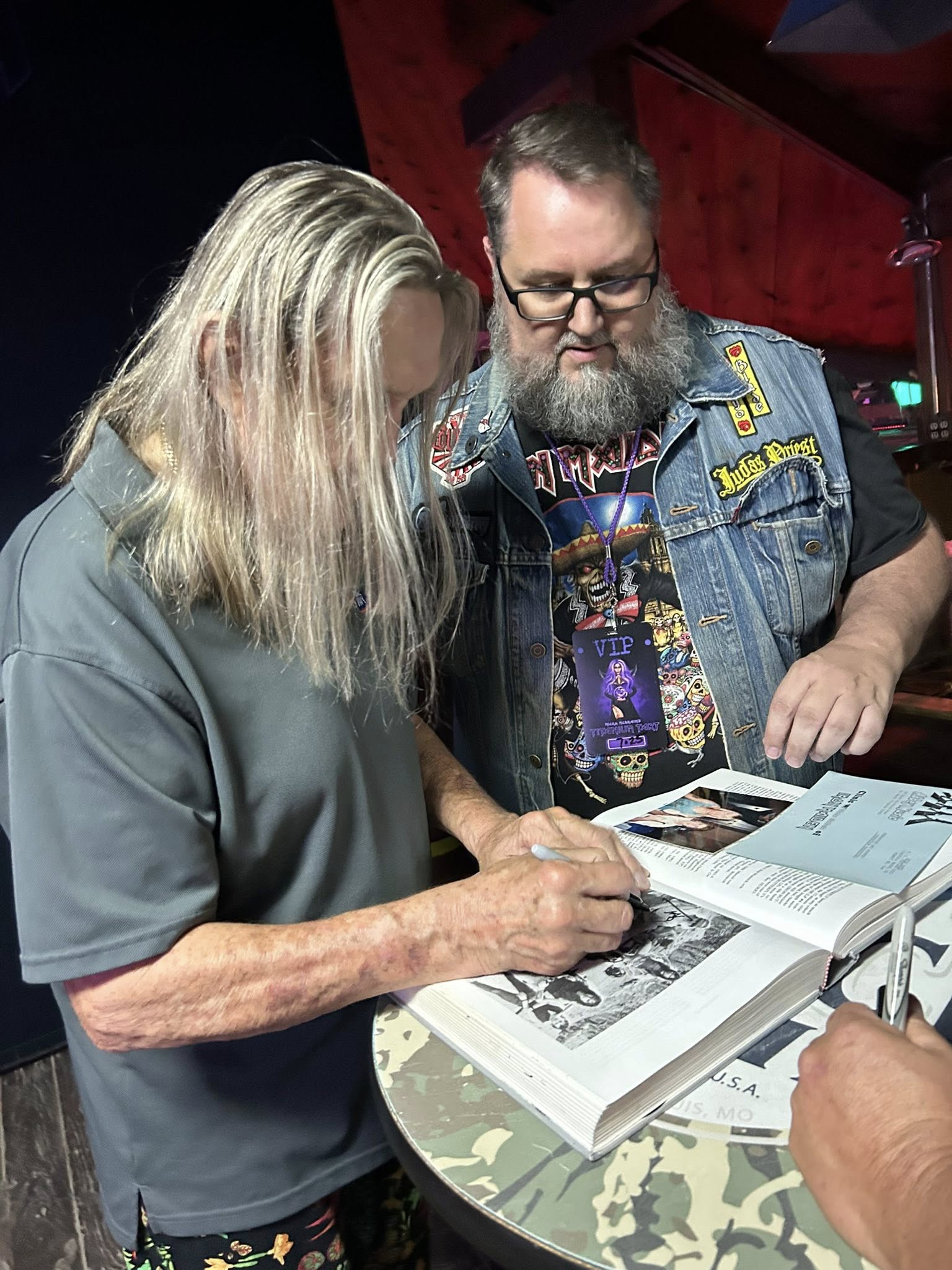 I’m up next and lay The Book out in front of him and he signed it. He was pretty indifferent about it but was digging our photo. I started recounting the events of that night and mentioned his former drum tech (RIP) and the Heineken. That affected him a little and he said he missed that guy. He said, “this must’ve been from 89” and I showed him the announcement flyer and explained it was Feb 1, 1988 pre-Seventh Son and that night was the first time I’d heard the title of the upcoming album. I asked if he’d sign the photo and he obliged. They had someone taking pics using our cameras and Kelz filmed most of my interaction with the man. We did the one main photo and he shook my hand and I asked him for a hug. He obliged and I told him in his ear how much I loved him and thanked him for a lifetime of music. He thanked me back and that was that. I was hoping to recreate our original photo as much as we could’ve but it just didn’t play out that way and I’m good with that.