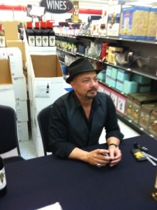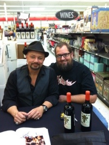 Geoff Tate’s Queensrÿche Facebook page announced today that he was doing a bottle signing for his Insania wine nearby. So I ran home, grabbed The Book, a photo I took of him at a signing in 1989 and headed up to Spec’s. Small crowd but it was cool meeting him again. He took special interest in The Book and asked how to get one. After the signing, his wife was giving out samples and I tried the red. I also bought some for myself. Good wine, pretty expensive though.