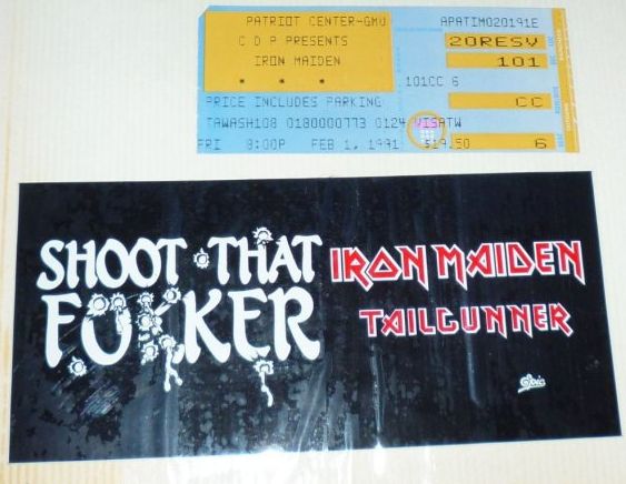 This was my 2nd Maiden show. Two pals of mine drove up with me to the Patriot Center in Fairfax, VA for this one. Anthrax was opening on their Persistence of Time Tour. I remember during Anthrax’s set that many of the folks in the front rows were sitting down and Belladonna had made some comments to the crowd about it. Security was pretty tight for this show. We had pretty decent seats up and off to the side. At the end of Tailgunner (the opening song), they dropped stickers down from the roof and that’s what’s under the ticket in the photo below.