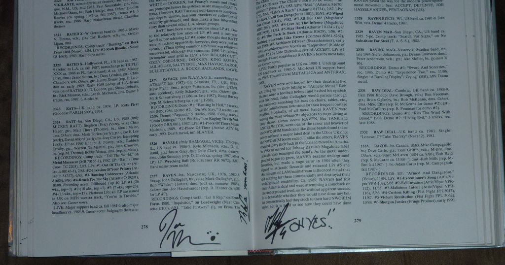They take off for the show and we bum around for a bit then head there ourselves. We’re on the list and get to go in the “upper room” above the bar while one of the opening bands was on. Hasselvander was up there and let me tell you, he is one of the coolest dudes around. We talked about Pentagram quite a bit as he was still involved at the time and his connection with Blue Cheer and his new band, Hounds of Hasselvander. He was putting on some eyeliner and with it he can really pass for Ozzy. Fun dude. He signed the book as well the Gallagher brothers and I went back to put it in the car. It’s a bit of a pain to lug around all night.