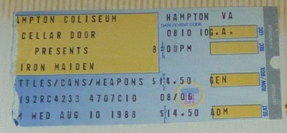 This was my 2nd Maiden show. Two pals of mine drove up with me to the Patriot Center in Fairfax, VA for this one. Anthrax was opening on their Persistence of Time Tour. I remember during Anthrax’s set that many of the folks in the front rows were sitting down and Belladonna had made some comments to the crowd about it. Security was pretty tight for this show. We had pretty decent seats up and off to the side. At the end of Tailgunner (the opening song), they dropped stickers down from the roof and that’s what’s under the ticket in the photo below.