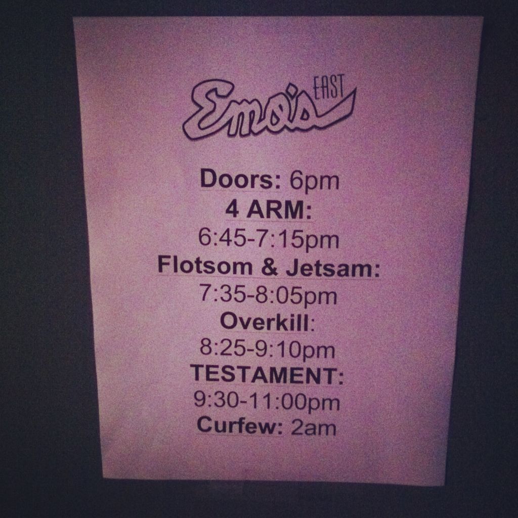 Not too long ago it was announced that Testament, Overkill, Flotsam and Jetsam, and 4arm were coming to Emo’s. What a lineup! I bought a ticket as soon as they went on sale.