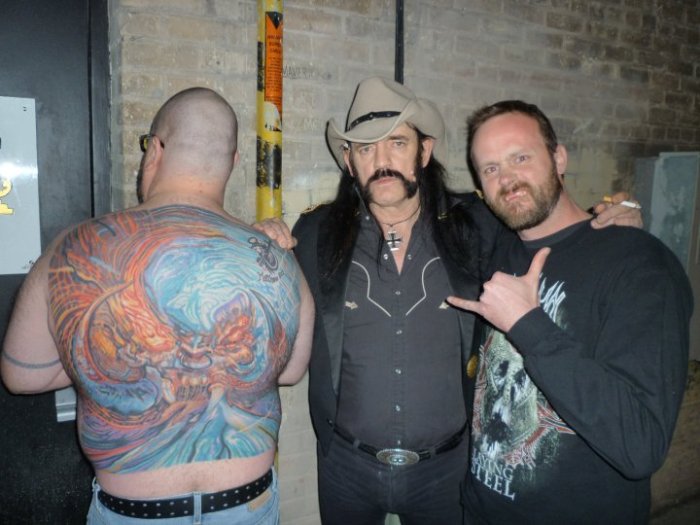 The band was standing in the alley just talking and making a few jokes about the movie and Marco and I just stood a few feet from them. Their conversation stopped and I looked at Lemmy and said, “Lem, I’ve got Another Perfect Day tattooed on my back and this is the guy who did the work. Can we get a photo or 2?” Thankfully he obliged. I removed my shirt and he said, “Motherfucker. That had to fucking hurt. Looks great.” We snapped 2 photos, thanked him then headed back to a bar to do a celebratory drink.